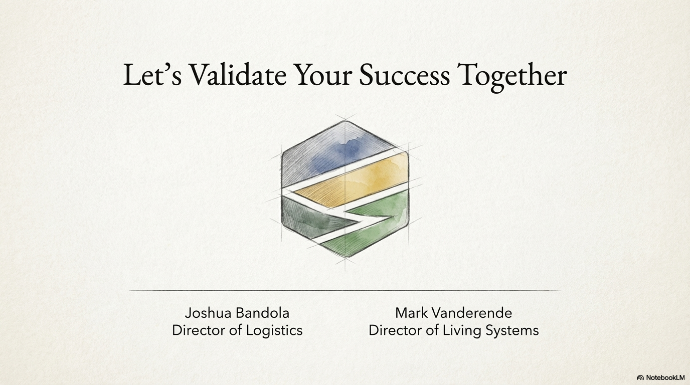 A professional closing slide titled 'Let’s Validate Your Success Together' featuring the HiveCoreWest hexagonal logo in a watercolor pencil-sketch style. Below the logo, the names and titles of the founders are listed: Joshua Bandola, Director of Logistics, and Mark Vanderende, Director of Living Systems, presented on a clean, textured off-white background.