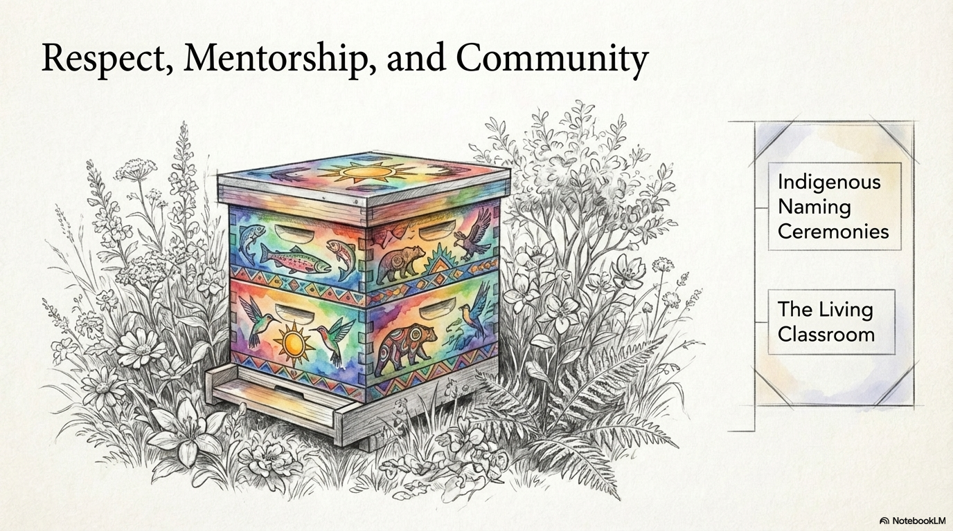 A pencil-sketch illustration of a traditional Langstroth beehive vividly painted with Indigenous-style art featuring bears, salmon, hummingbirds, and sun motifs. The hive is set in a meadow of wildflowers and ferns, accompanied by a diagram highlighting 'Indigenous Naming Ceremonies' and 'The Living Classroom' as part of HiveCoreWest’s community stewardship pilla