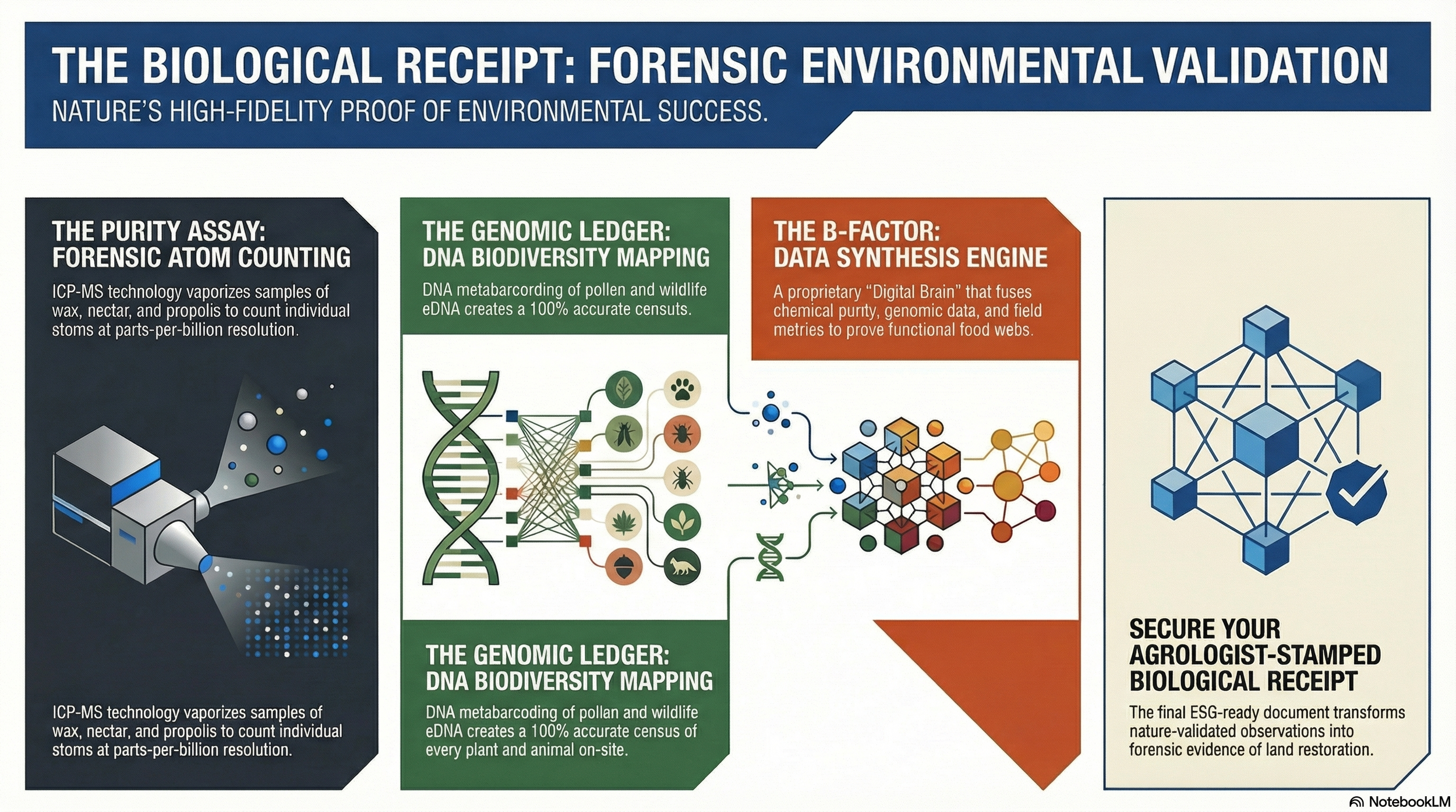 Pillar ImageOptimized Alt TextPillar 1: VitalityHoneybee hive thermal monitoring at a mine reclamation site showing the 35°C core temperature standard for ecosystem vitality.Pillar 2: PurityMicroscopic lab analysis of honeybee bio-matrices using ICP-MS to detect heavy metals and chemical purity in reclaimed landscapes.Pillar 3: GenomicsDNA metabarcoding and pollen sequencing graphics showing a 100% accurate biodiversity census and wildlife shadow on industrial land.Pillar 4: B-FactorThe B-Factor digital engine synthesizing field data and agrologist-stamped biological receipts for corporate ESG reporting.